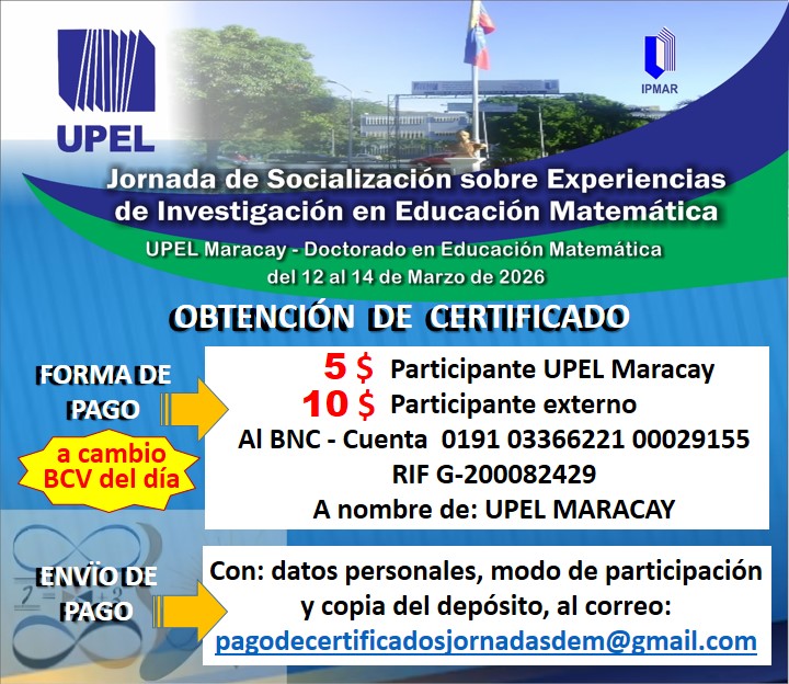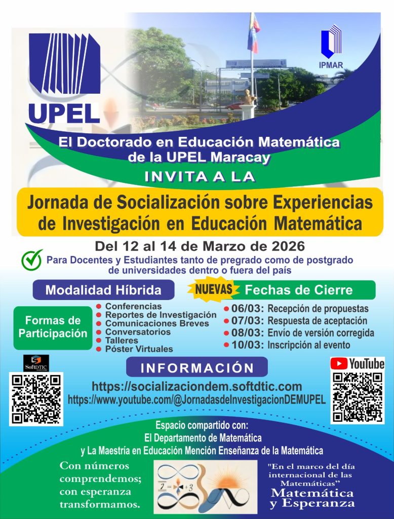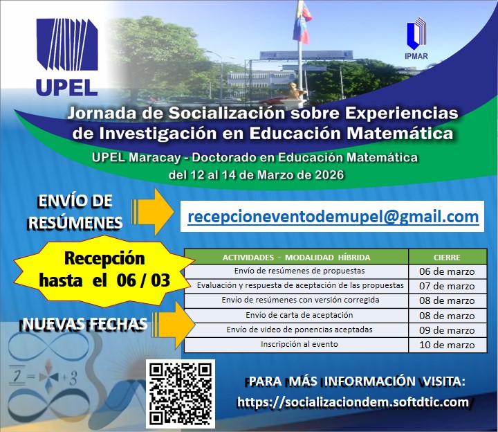 La Coordinación del DEM y sus Estudiantes, han decidido organizar este evento de socialización de experiencias en la realización de trabajos de Investigación en Educación Matemática desarrollados en el seno del Doctorado, en unión con aquellos de la Maestría de Educación mención Enseñanza de la Matemática y del Departamento de Matemática, como también la inclusión de trabajos de otras universidades dentro o fuera del país, con la finalidad de generar aportes que favorezcan el proceso de formación doctoral, el acercamiento entre pares, el impulso de las investigaciones y por ende del campo de la Educación Matemática